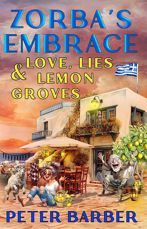 Book cover for A Parthenon On Our Roof by Author Peter Barber. Man and woman on a balcony in Greece, woman holding Greek and British flags.    Book cover of a man and woman on a boat near a Greek island. The boat flies Greek and British flags. Cover for A Parthenon in Pefki by Author Peter Barber,