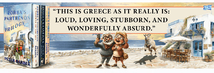 When a new wave of regulations threatens to close Zorba’s beloved seaside taverna once again, Peter and his formidable wife Alex rally the villagers to defend their tables, their traditions, and their right to argue loudly over dinner. What begins as a local skirmish soon spirals into full-blown municipal mayhem, complete with spoon-wielding grandmothers, a goat with diplomatic immunity, and a mayoral election that nobody actually wants to win.